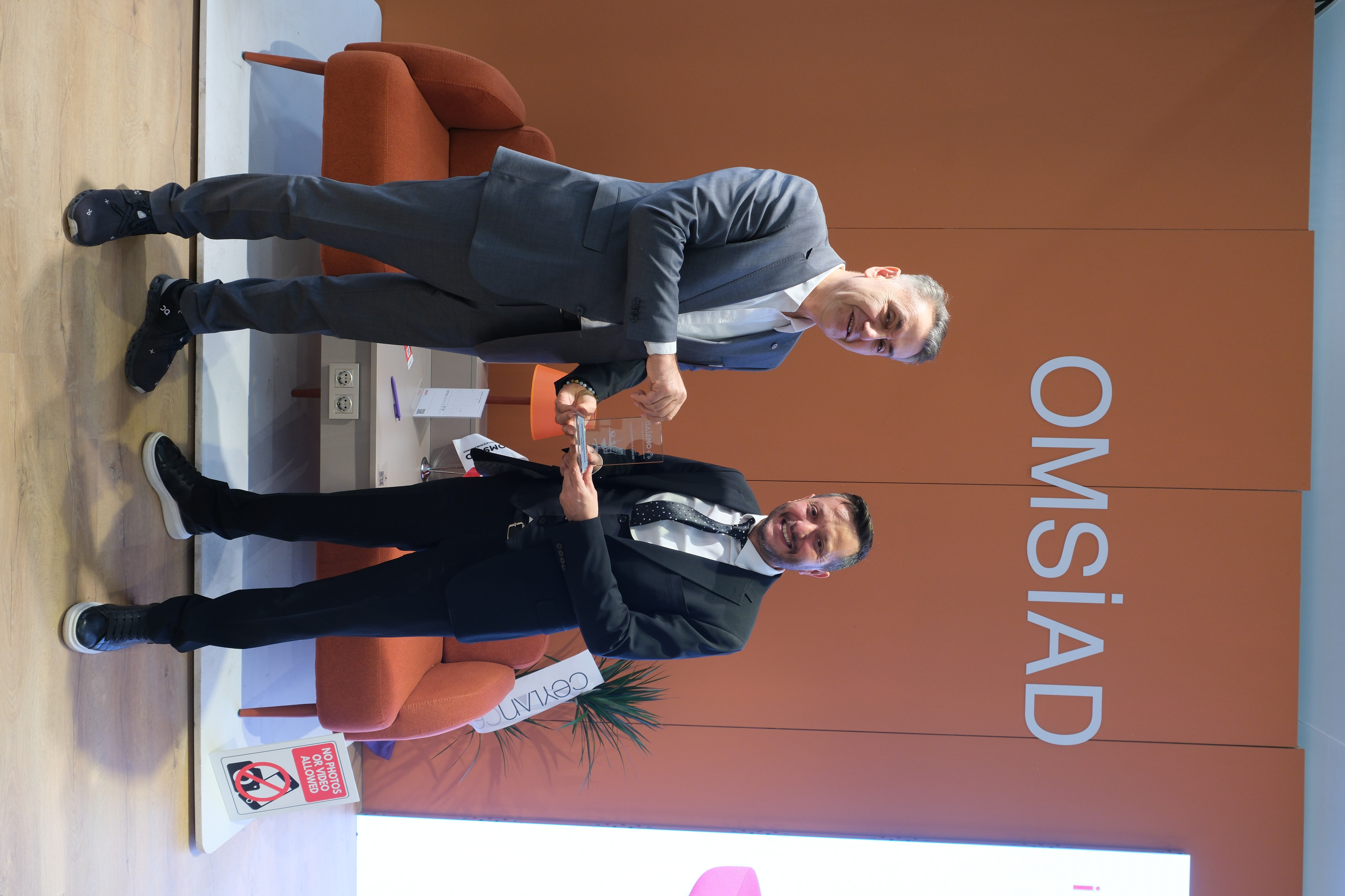 IIFF2026 Uluslararası İstanbul Mobilya Fuarında OMSİAD Cafe Alanı ve İlham Verenler Ödül Töreni Kokteyl Programının gerçekleşmesinde destek veren sponsorumuz Pala Deri Yöneticilerine Teşekkür Plaketini Yönetim Kurulu Başkanımız Ercan ATA takdim etti.
